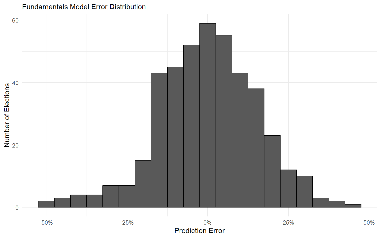 The fundamentals model is off by 12.05 percentage points on average. Even worse than the polls!