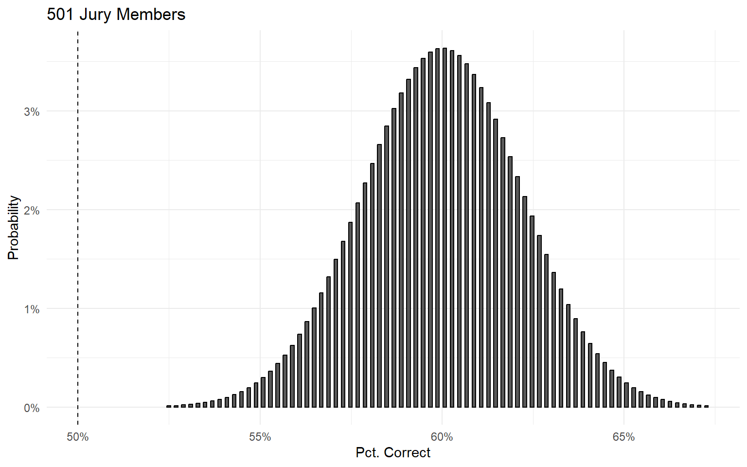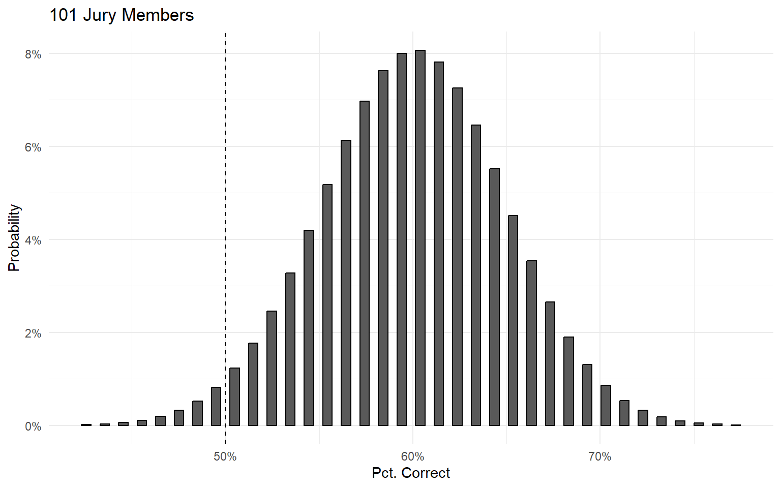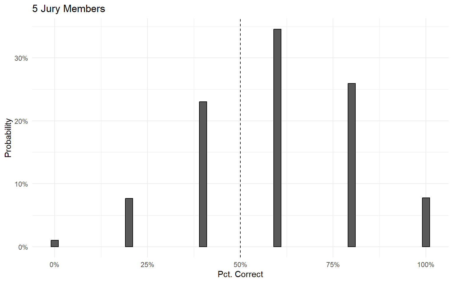 Example: A jury with 5 members, where each individual has a 60% probability of choosing the right answer.