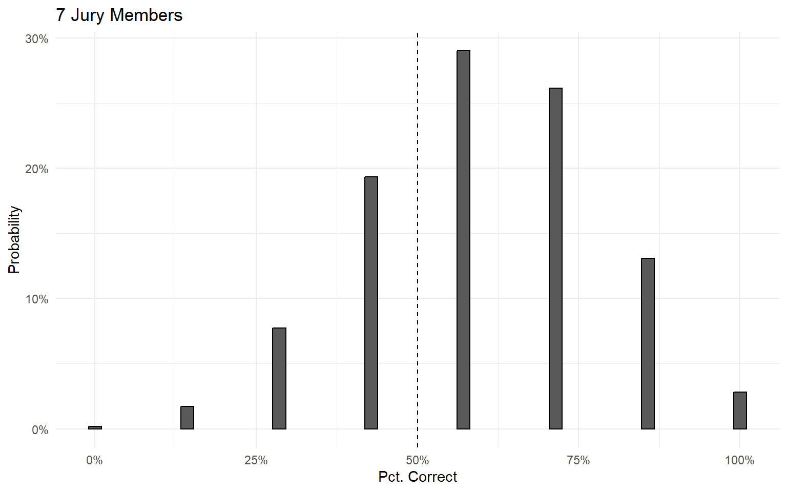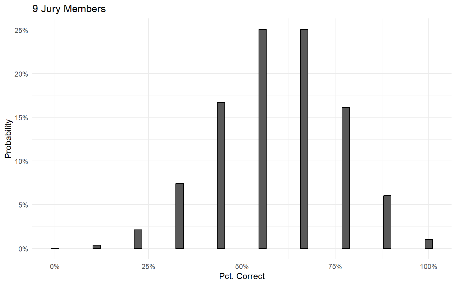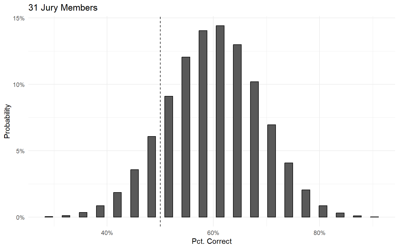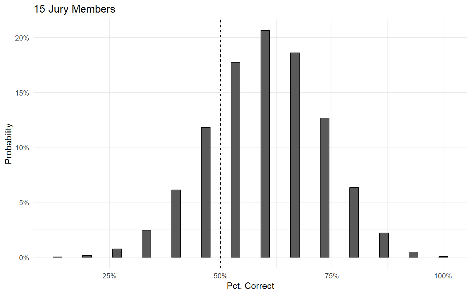 Example: A jury with 5 members, where each individual has a 60% probability of choosing the right answer.