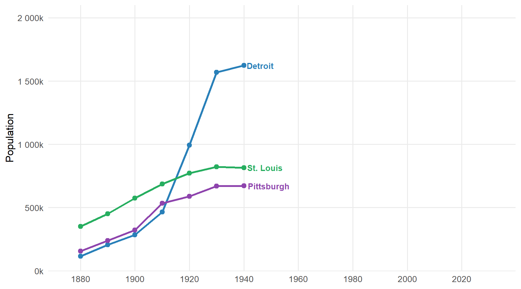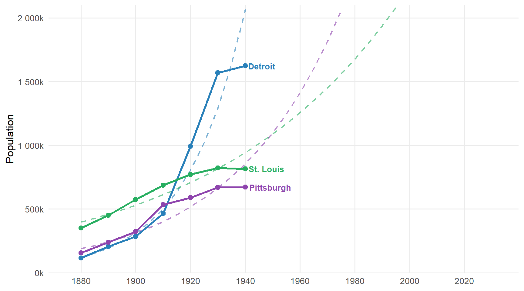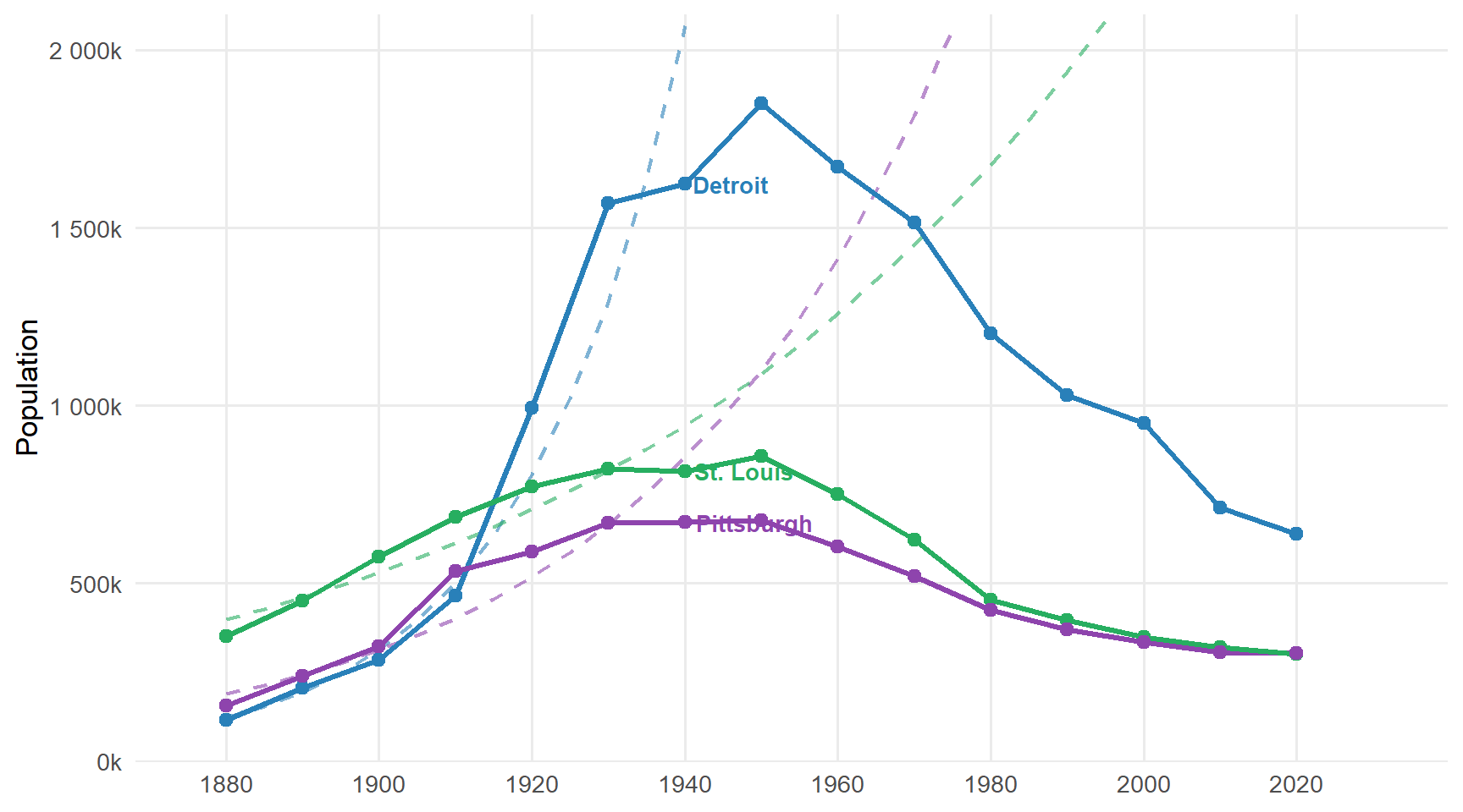 Detroit built housing for 1.8 million people. Only ~640k live there today. That surplus housing stock causes property values to collapse (glaeserUrbanDeclineDurable2005?).