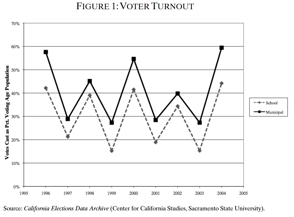 In 2006, Texas passed HB 1, which compelled 20% of the state’s school districts to switch from off-cycle to on-cycle election timing.