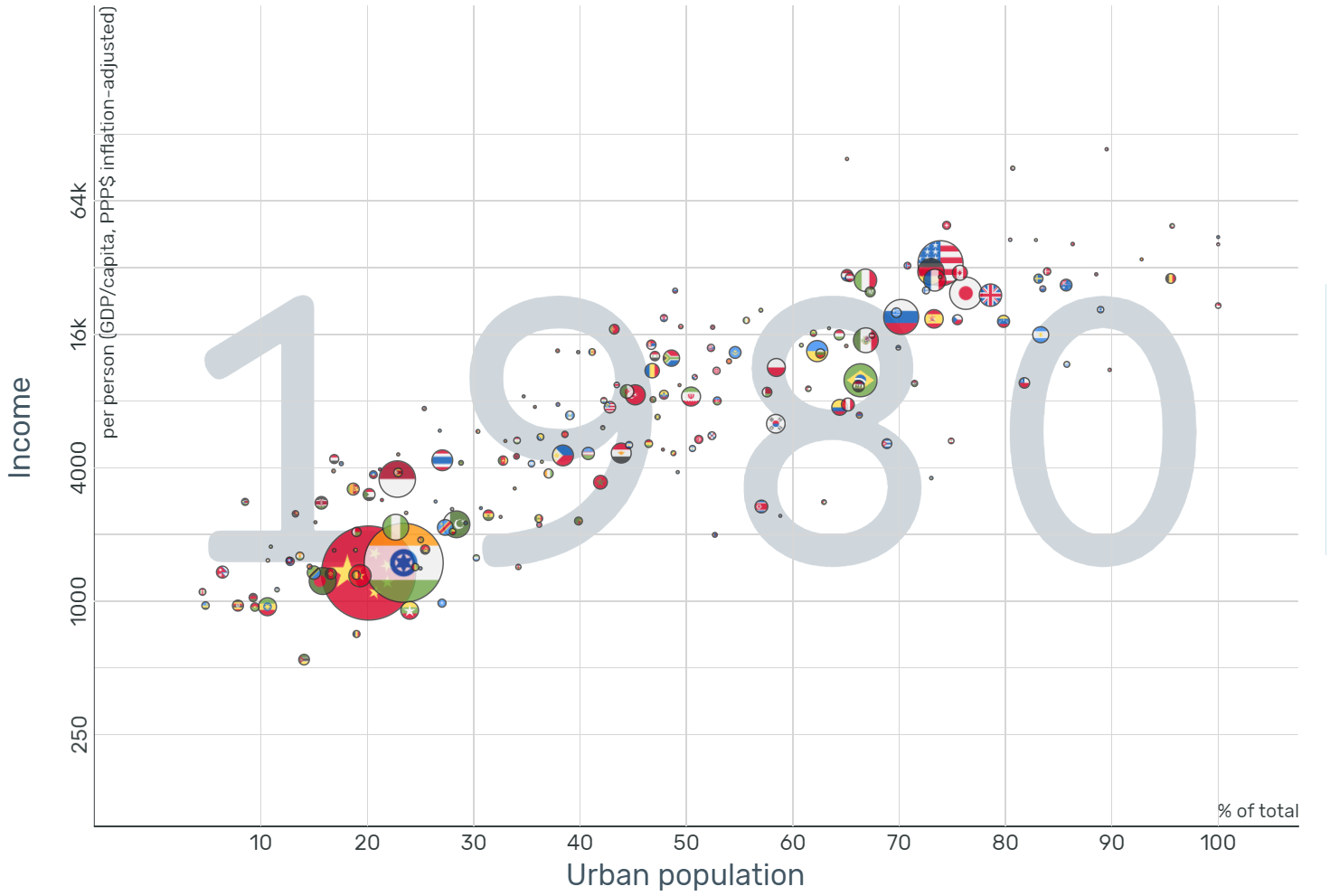 For all the reasons we discussed last week, cities create economic opportunities. Urbanized countries tend to be wealthier.